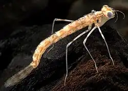 Eggs can hatch in about 20–21 days where the temperature is 20 degrees Celsius.[8] Nymphs then live for a year to a year and a half before metamorphosis takes place.[12] Before emergence, the nymphal darkens until it is nearly black in colour. The nymphs may take several short trips from the water a few days before emergence.[8] Emergence normally takes place on rush or grass stalks 10–40 cm above the water line.[8] It is common for there to be a high rate of mortality due to the moulting adult losing its grip on the substrate and ending up in a body of water where it can drown.[8]