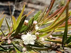 Austromyrtus tenuifolia has thin leaves; 1.5 to 4 cm long, and 1 to 3 mm wide. Flowers have 5 petals and short stalks and flower in late spring and summer. The berries are edible, dark purple when immature which then turn white with dark spots when mature.[1] The specific epithet tenuifolia is from Latin, meaning "thin leaved".[2][3] This plant first appeared in scientific literature in 1797 as Myrtus tenuifolia, published in the Transactions of the Linnean Society by the 18th century botanist James Edward Smith.