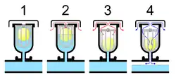 If the valve body is filled with water, the float moves upwards and closes the valve. If air collects in the valve body, the waterline lowers, as does the float, and the valve opens to release it.[4] To give more sealing force on the valve, the float generally works the valve through a lever. A greater movement of the float gives a shorter, but more forceful, movement of the valve. This lever mechanism may be simply, almost crudely, made of a pressed steel strip which acts as a bending hinge.[5]