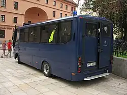 In 2005, a special version of the Autosan H7-10.04 was developed for the Police, known as the Autosan H7-10I.[16] This intervention bus was equipped with an Iveco 8040SCR21.11 engine, with a displacement of 3,908 cm3 and a maximum power of 100 kW (136 HP). It was designed for use by the Prevention Units and served to transport 30 people, including 28 officers with their equipment, the commander, and the driver.[16]