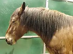 The Auvergne horse is a compact horse with light features of postier type,[3] close to a cavalry horse and similar to the Comtois horse but thinner. It stands at 1.43 to 1.57 metres (4 ft 8 in to 5 ft 2 in) at the withers and weighs between 450 and 650 kilograms (990 and 1,430 lb) with an average of about 500 kilograms (1,100 lb).[1] The head is very expressive,[3] rather small, short with a square nose, nostrils well open, a straight or slightly concave muzzle, eyes bright and expressive and almond-shaped highlighted by prominent eyebrows, a broad forehead, short and mobile ears.[1][4][5] Light heads are well-regarded.[5]