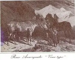 In Puy-de-Dôme horses had the same conformation and the same qualities as in Cantal but were deemed to be "less fine and less numerous" although the farming system was the same.[23] In Aveyron, Auvergne mares were crossed with stallions from Rodez and gave birth to a small horse (1.47 m) which formed the "country breed". In summer he lived in pastures where there was abundant food. In winter he returned to the stable "where he received any food, the waste from the feeding of cattle".[24]