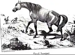 The horse was not tall, ranging from 1.43 to 1.47 metres (4 ft 8 in to 4 ft 10 in) according to Eugène Gayot,[29] less than 1.47 m according to Alexandre Bernard Vallon,.[30] and from 1.44 to 1.48 metres (4 ft 9 in to 4 ft 10 in) according to the Cardini dictionary.[25] It increased from 1.48 to 1.50 metres (4 ft 10 in to 4 ft 11 in) in the late 19th century according to the Revue d'Auvergne. The head is fine, short, and expressive with hollows above the eyes, keen eyes, ears very straight and very mobile, and with wide nostrils.[31] It seems stronger than the Limousin horse because it is smaller.[27] The neckline is arched or reversed[30] but rather short.[31] The mane is abundant and fine. Eugene Gayot said that when the wind blows the mane and forelock of the horses, it gives them a disheveled and very strange look.[29] The withers are high and good-looking,[30] sharp-edged[18] and often separated from the neck by a sharp line. The chest and body are narrow but the chest is deep, a condition for speed.[31] The back and loins conform well,[30] but the back can be long. The flanks are turned up or cordés.[31] The hips are protruding and the haunch is sharp,[30] short, angular and low - [27] slightly avalée or en pupitre. The leg is fine and muscular with a wide and well articulated knee, smooth cannons and well detached tendons - almost as big as the bone. Members are spotless, dry and nervous, and free of defects[32] but sometimes they have defects of plumb. The hock is hooked[30] and closed[27] but big enough, the pastern is short. The foot is small and well formed terminated by a very hard black hoof.[30]