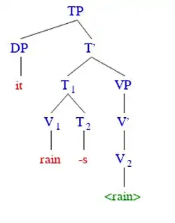 Figure 1. Syntax phrase structure tree. This English sentence reads, "It rains." N.B. The angled brackets around "rain" indicate syntactic movement. The tree was creating using phpSyntaxTree.[6]