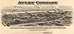 In 1912, the entire Avery Company plant covered more than twenty-seven acres. The company, progressive for its time, established a dispensary on site that was staffed five hours each day by two doctors.[8] It also started its own insurance company about the same time.[4] The main factory building and the associated warehouses covered another six and a half acres. The sections of the plant were joined by a company-designed trolley system used to transport parts. At the time, it manufactured steam and gasoline traction engines, mounted steel water tanks, self-lift plows, farm wagons, corn planters, traction hauling wagons, traction steam shovels, threshing machinery and all required attachments, riding and walking cultivators, single and double row stalk cutters and gasoline tractors. At its height, it called itself "The Largest Tractor Company in the World" and employed 2,600 men, manufacturing eight different tractors along with motor cultivators and trucks.[1][5] The company offered a broad line of tractors and engines, ranging from one–row cultivator to a huge 80 horsepower (60 kW) tractor.