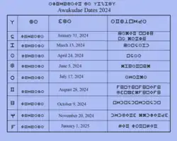 The festival is observed on Wednesday, and its recurrence could be after 40 or 42 days. It is celebrated particularly in the Eastern Region. It is one of the two forms of Adae, the other being Akwasidae, which is celebrated the third Sunday after Awukudae.[3] The observance is an ancestral rite by the chiefs and elders of the Akan clan around Kumasi. The Tuesday which falls 8 days before Awukudae is known as Kwabena; and the Saturday following Awukudae is known as "Memeneda Dapaa". The festival announcement is made by drummers the evening before on "Dapaa" day. After every eight Awukudae Festivals, the "Adae Butu" ritual marks the start of the Odwira festival.[4]