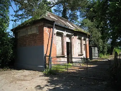 Street-level building of the former station in May 2009, seen from the B4031 road. The path on the right leads up to the site of the former up platform.