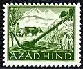 ½ Anna | Dark yellow-green | For the Andaman and Nicobar Islands without surcharge: Ploughing farmer in front of a mountainous landscape. In front of it a plough and sheaves |