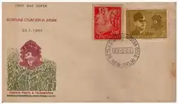 As the stamps have not been issued, it is not possible that they exist with a real cancellation. In 1964 Subhas Chandra Bose was honoured in India by the Indian Post with two stamps. On this occasion first day covers with Bose stamps were also published. On some of these letters, as a "mixed franking", Azad Hind stamps were additionally attached and then cancelled. Also cancellations of exclusively used Azad Hind stamps on first day covers are known.[7] The same was done with Indian first day covers from 1968.[8]