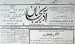 Azarbayjan, Joz-e la-yanfakk-e Iran ("Azerbaijan, an Inseparable Part of Iran") was a bilingual newspaper published in Baku by the local Committee of the Democrat Party of Qajar Iran. It was published on 10 February 1918 as a response to the viewpoint expressed in the Açiq Söz newspaper by the Musavat party, which they saw as an attempt by pan-Turkists to undermine the territorial integrity and sovereignty of Iran. Recruited from the Iranian Azerbaijani population in Baku and its neighbouring areas, the Democrat Party's Baku Committee was established by Mohammad Khan Tarbiyat in 1914.[1] The editor of the newspaper was Mirza Aliqoli.[2]