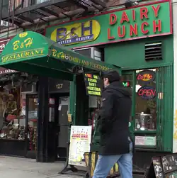 B&H Dairy is a kosher Jewish dairy restaurant or luncheonette in the East Village of Manhattan in New York City. The original owners, Abie Bergson and Jack Heller, later Sol Hausman, opened it in 1938[1] when the area was known for the Yiddish Theatre District. Bergson was an aspiring actor, and Molly Picon and Maurice Schwartz were patrons. Bergson sold the luncheonette in the 1970s and it went bankrupt in 1978. Bob Sherman, a partner in a construction firm, bought it.[2][3] A 1940s style lunch counter[4] B&H serves cheese blintzes with sour cream, borscht, matzo brei, and other kosher dairy Jewish cuisine known as milchik.[5] It is owned and operated by an Egyptian Muslim and Catholic Polish couple, Fawzy and Alexandra Abdelwahed.[6] It was closed for a few months in 2015 due to a nearby gas explosion and fire but reopened.[7][8] It was noted in an interview by Lily Tomlin.[9]