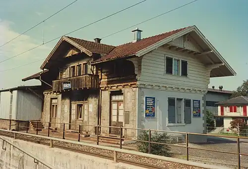 Bäch railway station is a railway station in the Swiss canton of Schwyz and municipality of Freienbach.[3] The station is located on the Lake Zurich left-bank railway line.[4] It lies within fare zone 181 of the Zürcher Verkehrsverbund (ZVV).[2]