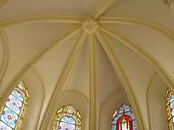 Based on neo-Gothic design, Béthanie is a composition of symmetrical cylinders. Apart from that, ogive, tracery, stained glass and Gothic arched windows can be found in the building. With a high ceiling and pitched roof, the George C. Tso Memorial Chapel is a typical illustration of neo-Gothic architectures in Béthanie, though in a much simpler style and smaller scale. Among its nineteen stained glass windows, nine were originals. The remaining ones, either in disrepair or missing, were reproduced hand-made in the Philippines. Also, only four out of the twelve statues of the apostles, originally standing on corbels above the altar, have been found. Although the genuine ones were unavailable for exhibition, the Academy has replicated the statues with a silicone molding technique. Moreover, many neo-gothic structures within the perimeter have been conserved. One of these examples are the flying buttresses that were used to support the exteriors of buildings in the past. Although no longer functional, they have been restored to maintain authenticity. The Rib vaults, built in to support the ceiling and roof have also been retained in the chapel for decorative purposes.