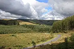 The road runs partly along a section of the upper Ystwyth valley, passing the remains of the Cwmystwyth Mines,[6][7] a monumental arch built to commemorate George III's golden jubilee, and the Hafod Estate.[8]