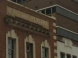 The George Street facade is symmetrically composed, with a central feature at upper level of a small balcony supported on corbels with a wrought iron balustrade. A pair of French doors, surmounted by a fanlight, open out on to this balcony. A round window decorated with festoons is directly below the balcony, followed by another small square window directly below this. A sign is located at the top of the facade, with the raised lettering "B.A.F.S Dispensary 1885-1915" The sign sits upon a short and simple entablature with prominent dentils. Mortar and pestles are mounted at each corner of the facade.[1]