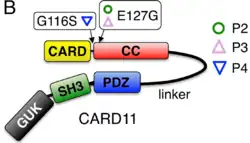 - ^ a b c d e f g Turvey, SE; Durandy, A; Fischer, A; Fung, SY; Geha, RS; Gewies, A; Giese, T; Greil, J; Keller, B; McKinnon, ML; Neven, B; Rozmus, J; Ruland, J; Snow, AL; Stepensky, P; Warnatz, K (2014). "The CARD11-BCL10-MALT1 (CBM) signalosome complex: Stepping into the limelight of human primary immunodeficiency". The Journal of Allergy and Clinical Immunology. 134 (2): 276–84. doi:10.1016/j.jaci.2014.06.015. PMC 4167767. PMID 25087226.