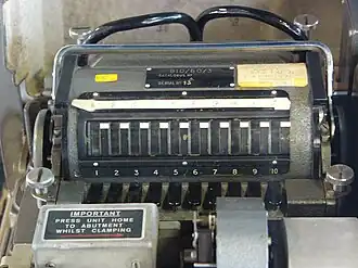 BID/60, also called Singlet,[1] was a British encryption machine. It was used by the British intelligence services from around 1949 or 1950 onwards. The system is a rotor machine, and would appear to have used 10 rotors. There are some apparent similarities between this machine and the US / NATO KL-7 device.