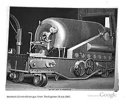 Later in 1880, a 43 ton gun was mentioned as being prepared at Woolwich for trial. It was 358 inches (9.1 m) long and meant to use a charge of 285 pounds (129 kg) of P2 powder to fire a projectile of 714 pounds (324 kg). Other guns being prepared were a 10.4-inch 26 ton gun and a 9.2-inch 18 ton gun. By then EOC had received an order for 18 BL 6-inch 80-pounder gun and one 43 ton breechloader.[11][12] In December 1880, the 43 ton gun fired two shots at the proof butts with charges of 200 pounds (91 kg) and 250 pounds (110 kg).[13] In March 1881, the Committee on Ordnance was dissolved. By then a single 43 ton gun had been completed and prooved. In April 1881, a new Ordnance Committee was appointed.[12]