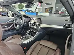 Most of the interior is carried over from the G20 3 Series upholstered in SensaTec faux leather with front sports seat being standard. The interior is offered in five colours with full leather upholstery being optional. The rear seats fold down to provide a total boot capacity of 440 L (15.5 cu ft). The iDrive 7.0 system is standard and features an 8.8-inch screen on the centre console along with a 5.1-inch screen in the instrument cluster. A 10.3 inch screen for the infotainment system along with a 12.3 inch screen for the instrument cluster are optional. The iDrive 7.0 has over-the-air updates for the navigational maps and operating system, and features a voice-controlled digital assistant. The 4 Series comes standard with the BMW navigation, the next-generation BMW head-up display, which has a 70 percent larger projection surface, and 3D environment visualization within the digital instrument cluster. Apple Car Play and Android Auto are also standard interior amenities. A Driving Assistance Professional package is optional, which adds adaptive cruise control with stop and go, lane-keep assist with side collision avoidance, and rear automatic emergency braking.[12][13]