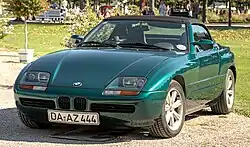 The BMW Z1 is a two-seat roadster developed by BMW and was produced from March 1989 to June 1991. It was based on the E30 3 Series platform.[3] The Z1 featured unusual doors which, instead of opening outward or upward, dropped into the door sills and had body panels which could easily be removed and replaced; the car could be driven with all its body panels removed for weight reduction and increased performance.[4] Only 8,000 examples of the Z1 were produced.[5]