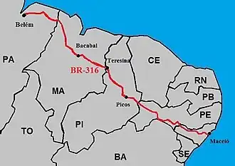 The BR-316 is a Brazilian federal highway that connects the cities of Belém, in the state of Pará, and Maceió in Alagoas.[1] It has a total length of 2,054 km.[2][3]