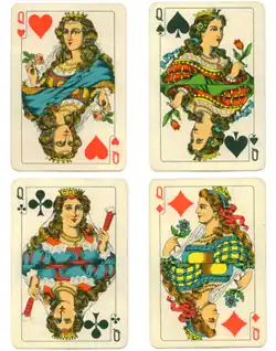 In 1962, a Kashubian Baedeker, tells readers that if you see "a group of players slapping down cards with gusto and shouts of 'Wedding' or 'Zolo'..." they will be Kashubian Baśka players. It goes on to say that, to understand the game it is better not to be a card player as everything is topsy turvy with Queens outranking Kings.[2] This suggests it was once played with more cards (such as Kings) than is normal today.