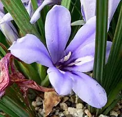 The mostly intensely violet-scented (but sometimes scentless) flowers are clustered with few or several in dense spikes. The mirror-symmetrical perianth consists of six tepals that are merged into a narrow tube for 35–60 mm (1.4–2.4 in), funnel-shaped higher up and free near the top, the lobes 20–35 mm (0.79–1.38 in) long and 5–12 mm (0.20–0.47 in) wide and often overlapping even when fully open. The perianth does not form two obvious lips though and is blue to violet-coloured. The lower lateral tepals have a white marking in the middle that is offset by a clear or vague blue to carmine line around its perimeter and sometimes a splash of carmine down the middle. The three lower tepals may be merged up to 2 mm higher than the others. The three stamens are clustered at the dorsal side of the flower, have approximately straight filaments of 10–20 mm (0.39–0.79 in) long and are topped by 7–10 mm (0.28–0.39 in) whitish anthers. The ovary is hairless, and may be on a short stalk in the lowers flower of the inflorescence. The style branches into three arms opposite the lower two-thirds of the anthers.[1][2]