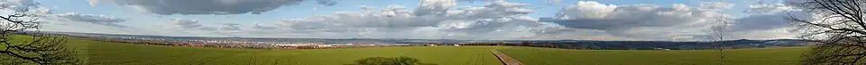 The poplar stands on the unwooded 335-meter-high Zughübel, above sea level, with unobstructed views in all directions, especially to Dresden, about 110 meters above sea level, and to Saxon Switzerland. It is located about nine kilometers south of the Inner Old Town of Dresden and about 800 meters west of Babisnau, stands about 220 meters above the Elbe River, and is surrounded by agricultural fields. The poplar is located directly on the boundary between the districts of Babisnau, a district of Kreischa, and Golberode, a district of Bannewitz. In the immediate vicinity is a viewing platform and about ten meters away is the Bismarck oak, planted in 1890. On April 8, 2006, another black poplar was planted a few meters away, which grew from a cutting of the old poplar. The panorama from the poplar and the platform includes the wooded escarpment to the north above the broad Elbe valley widening, which borders the West Lusatian hill and mountain landscape to the south. This landscape can be traced from the Borsberg at 361 meters above sea level down to the Lößnitz Heights. To the east, the relief of the table mountains of the Elbe Sandstone Mountains is visible, and in the south, the mountain range featuring the Quohrener Kipse, the Hermsdorfer Berg, and the Wilisch frames the Kreischa basin.[1]