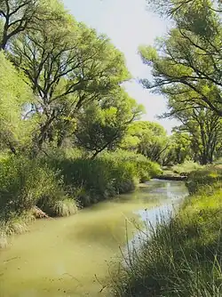 The Babocomari River is a major tributary of the upper San Pedro River in southeastern Arizona. The river begins in the Sonoita Basin near the community of Elgin, Arizona, and flows eastward for approximately 25 miles (40 km) before merging with the San Pedro, just south of the Fairbank Historic Townsite in the San Pedro Riparian National Conservation Area. The Babocomari drains an area of about 310 square miles (800 km2), including the northern Huachuca Mountains, the northwestern Canelo Hills, and the southern Mustang Mountains, and is one of three drainages of the Sonoita Basin, the other two being Sonoita Creek and Cienega Creek. Vegetation consists of riparian trees along the main channel and small marshy grasslands.[2]