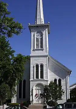 Babylon had already been settled, as Huntington South, prior to hostilities with the British in the Revolutionary War. The First Presbyterian Church of Islip and Huntington South, as it was then known, was established in 1730.[4] Though the church would later be split into two separate Huntington South and Islip churches in 1857 (the former to be renamed the First Presbyterian Church of Babylon after 1872). However, long before this split, the First Presbyterian Church held services in the original wooden church until 1778 when British soldiers tore down the structure. The wood from the first church was taken west to Hempstead to construct a barracks for British troops. This event was more recent history when, on the eve of the War of 1812, Joshua Hartt gave an impassioned sermon encouraging the young men to defend the United States and prepare for a "righteous war."[5]