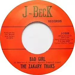 "Bad Girl" is a song by the American garage rock band the Zakary Thaks, written by the whole group—Chris Gerniottis, Pete Stinson, Stan Moore, Rex Gregory, and John Lopez—and was first released for the band's debut single on J-Beck Records in July 1966 (see 1966 in music). The song was an immensely successful regional hit in Texas, precipitating "Bad Girl"'s national release on Mercury Records later in the year. Since its initial distribution, the tune has received further recognition for its appearance on several compilation albums.