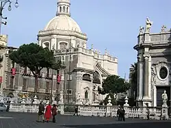 View of the facade and dome of the Badia, on the right of the photo is a portion of Catania Cathedral
