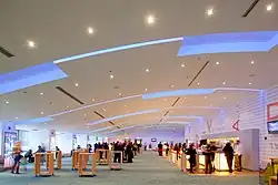 The Hallway is the main reception area for visitors. The most common uses for the receipt of tickets, registering participants and screened. In this area there are 8 service counters, hung flat screen TFT panels and illuminated system (banners), buffer flow control for the increased attendance and lift for the disabled. In March 2012, Badminton Theater implemented an electronic barcode check-in system.