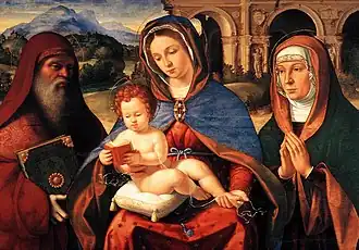 The Baglioni Madonna or Madonna and Child with Saint Jerome and Saint Anne is an oil on panel painting by Andrea Previtali, executed c. 1512–1513, now in the art gallery of the Accademia Carrara in Bergamo. His earliest surviving work, it is signed ANDREAS.BER.PIN.[1] Since 1900 it has been named after its last private owner Francesco Baglioni, who gave it to its present home. It belongs to the sacra conversazione genre. It was restored in 2011 by Amalia Pacia of the Sovraintendenza per i Beni Storici Artistici ed Etnoatropologici di Mialno and Maria Cristina Rodeschini from the Accademia Carrara