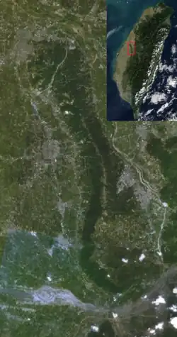 The Pakua Plateau or Bagua Plateau (Chinese: 八卦台地; pinyin: Bāguà Táidì), also known as the Pakua Mountain Range (八卦山脈), is a plateau located in central-western Taiwan. It stretches across Changhua County and Nantou County. The plateau borders the Changhua Plain in the west and the Taichung Basin in the east. It is long and narrow, with a length of about 32 km and a width of about 4 to 7 km. The highest peak of the plateau is Hengshan mountain, which has a height of 424m.[1][2][3][4]