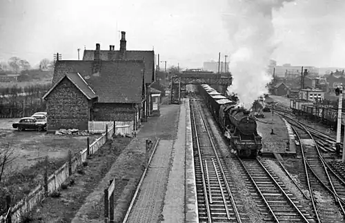 Served by the Stockport, Timperley and Altrincham Junction Railway (ST&AJ), Baguley station was opened on 1 December 1865. From 15 August 1867, the ST&AJ became part of the Cheshire Lines Committee (CLC) and from the Grouping of 1923, the CLC was owned jointly by the London and North Eastern Railway and London, Midland and Scottish Railway companies.[1] The station then passed under the control of the London Midland Region of British Railways upon nationalisation in 1948.