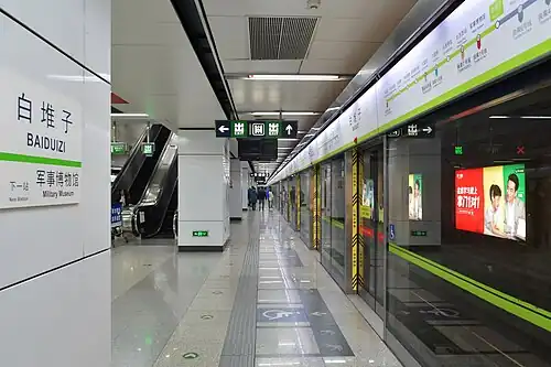 Baiduizi (Chinese: 白堆子站; pinyin: Báiduīzǐ Zhàn) is a station on Line 9 of the Beijing Subway.[1][2] This station opened on December 30, 2012.[3]