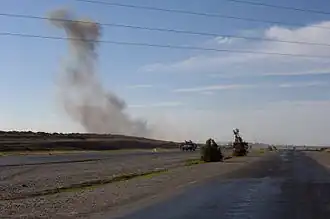 Smoke and dust mark the spot where a Humvee was damaged in an IED attack in Baiji, March 27, 2006