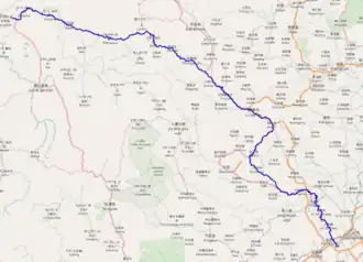 The Bailong River, in name, rises in Gansu's Luqu County, just west of the town of Langmusi. The river drains the northern sections of the Min Mountains and then flows through Zhugqu and Longnan before meeting the Jialing River in Guangyuan, Sichuan.[5] The main stem of the river, however, is actually a tributary that has its source in the Min Mountains, north of Songpan.[6]