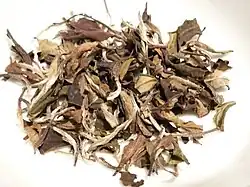Bai Mudan (Chinese: ; pinyin: bái mǔdān; Wade–Giles: pai2 mu3-tan1; lit. 'white peony') is a type of white tea made from plucks each with one leaf shoot and two immediate young leaves (one bud two leaf ratio) of the Camellia sinensis plant.[1] Bai Mudan is sometimes preferred by white tea drinkers for its fuller flavor and greater potency than the other major type of white tea, Bai Hao Yinzhen. The latter is made purely with leaf shoots, and so it is comparatively softer and more subtle. The typical taste of Bai Mudan is a result of both the processing and the tea plant cultivars employed in the production.