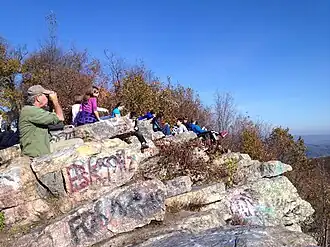 Bake Oven Knob offers views on either side of the Appalachian Trail, facing north and south, making the spot popular for hawk and eagle watching.[5] However, due to their accessibility, these lookouts are often crowded, and have become heavily vandalized.[6]