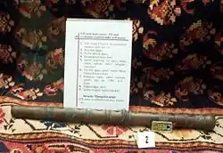 The balaban or balaman[7] (Azerbaijani: Balaban) is a double-reed pipe with cylindrical bore, about 35 centimetres (14 in) in length, with eight finger holes and one thumb hole, which is played in the eastern part of Iran's historic Azerbaijan region as well as in the Republic of Azerbaijan (where it is also called düdük, according to the Encyclopædia Iranica).[6] The Azeri balaban, the Turkish mey, and the Armenian duduk are almost identical, except for historical and geographical differences.[8]
