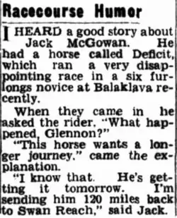 20. ^ Vox (15 May 1952). "Racecourse Humor". The Chronicle (Adelaide). Retrieved 30 July 2021.