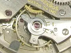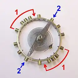 Modern (2007) watch balance wheels are usually made of Glucydur, a low thermal expansion alloy of beryllium, copper and iron, with springs of a low thermal coefficient of elasticity alloy such as Nivarox.[1] The two alloys are matched so their residual temperature responses cancel out, resulting in even lower temperature error. The wheels are smooth, to reduce air friction, and the pivots are supported on precision jewel bearings made of synthetic sapphire. Older balance wheels used weight screws around the rim to adjust the poise (balance), but modern wheels are computer-poised at the factory, using a laser to burn a precise pit in the rim to make them balanced.[2] Balance wheels rotate about 1+1⁄2 turns with each swing, that is, about 270° to each side of their center equilibrium position. The rate of the balance wheel is adjusted with the regulator, a lever with a narrow slit on the end through which the balance spring passes. This holds the part of the spring behind the slit stationary. Moving the lever slides the slit up and down the balance spring, changing its effective length, and thus the resonant vibration rate of the balance. Since the regulator interferes with the spring's action, chronometers and some precision watches have "free sprung" balances with no regulator, such as the Gyromax.[1] Their rate is adjusted by weight screws on the balance rim.