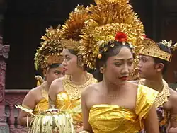 Balinese dance (Indonesian: tarian Bali; Balinese: ᬇᬕᭂᬮᬦ᭄ᬩᬮᬶ (igélan Bali)) is an ancient dance tradition that is part of the religious and artistic expression among the Balinese people of Bali island, Indonesia. Balinese dance is dynamic, angular, and intensely expressive.[1] Balinese dancers express the stories of dance-drama through bodily gestures including gestures of fingers, hands, head, and eyes.