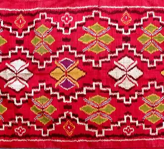 Geringsing is the name of the double ikat cloth that is woven in the village of Tenganan Pegringsinga.[12] About 20 patterns of geringsing are known and the dimensions of the cloths range from 20 cm to 60 cm wide and can be over 2 meter long. The palette of geringsing is typically red, neutral, and black. Geringsing are regarded as sacred cloths, "ascribed supernatural properties, especially to assist in forms of healing, including exorcism."[13] It is mentioned in the poem Rangga Lawe which tells of the first Majapahit king, Raden Wijaya giving his warriors gerinsing sashes to protect them in Battle.[14] The first European to describe geringseng was W.O.J Nieuwenkamp; he discovered where they came from and made a journey to Tenganan.[15]