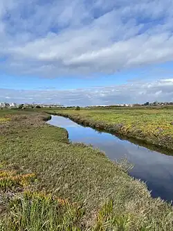 Wetland flora includes pickleweed, alkali heath, saltgrass, salt marsh dodder, arrowgrass, glasswort, and upland species like coyote bush and goldenbush.[17]