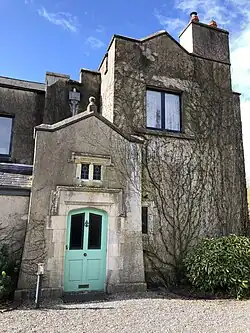 Built in the early 17th century in the Elizabethan style, it was a two-storey house. The south façade of the house comprised seven bays topped with crenelations and with buttresses at either end.[3][14] The house was reroofed and refurbished by James Barry in the 1850s and 1860s due to problems with damp. In 1904 James Bury-Barry built a two-storey extension to the north side of the house with a ballroom on the ground floor and a Tudor-Revival staircase.[2][15] This extension is of Gothic Revival design with a Tudor arch entrance and limestone pinnacles.[16]