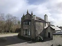 There is a large courtyard to the west of the house, which was connected to the western gable of the original house, a walled garden to the north of the house, a farmyard to the north-west and a thrashing mill. There were two driveways, to the south and east, both with gate lodges.[17] The eastern side of the courtyard has the remains of a bread oven, with the remains of stables and coach house to other sides.[18]