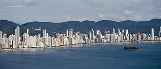Balneário Camboriú (Portuguese pronunciation: [bawneˈaɾju kɐ̃boɾiˈu]) is a coastal city in the southern Brazilian state of Santa Catarina. The city is built on steep hills which drop down to the sea. It is a popular tourist destination for South Americans, who are drawn to its main ocean boulevard Avenida Atlântica (Atlantic Avenue), and who swell the city's population from 145,796 (2020 census office estimate) to over one million in the summer.[3] The city is famous for its unique beach-to-beach cable car which links its central beach with the beach of Laranjeiras. Balneário Camboriú is located 10 km (6.2 mi) south of the city of Itajaí, 96 km (60 mi) south of the city of Joinville, and 80 km (50 mi) north of the state capital, Florianópolis.